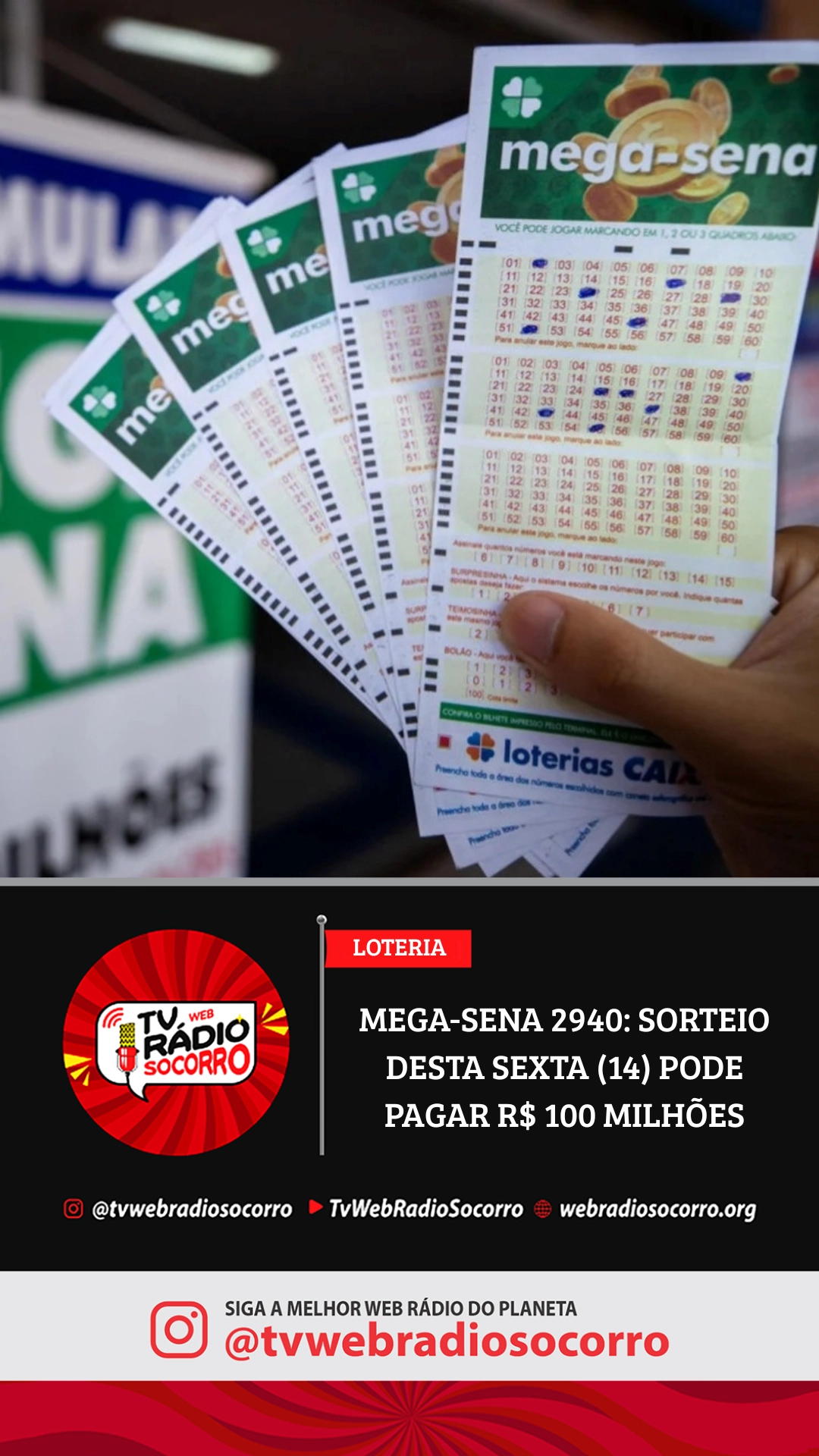 O sorteio da Mega-Sena desta sexta-feira, dia 14, pode pagar um prêmio de R$ 100 milhões para quem acertar as seis dezenas premiadas. O concurso ocorre às 21 horas, no Espaço da Sorte, em São Paulo (SP). As pessoas interessadas em concorrer têm até as 20 horas para fazerem suas apostas.